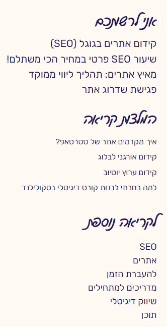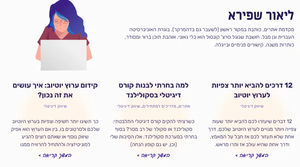 באתרים מבוססי בלוג, שהלקוחות רוצים גם ידע ולא צריכים מוצר כאן ועכשיו, אני ממליצה מאוד ליצור קישוריות פנימית בין מאמרים. אתרים מבוססי בלוג יכולים להיות אתרים של מטפלים או של מקצועות שעושים סקר שוק לפני שסוגרים איתם כמו עורכי דין או יועצי משכנתאות.