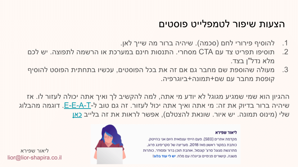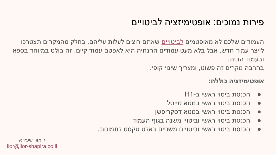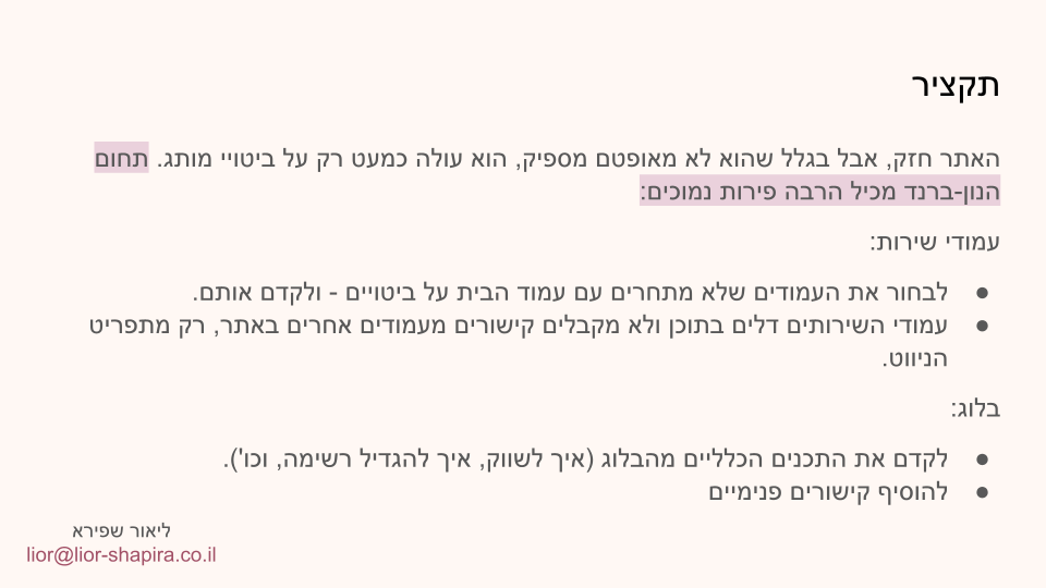 כשאני מסיימת את דוח הSEO, אנחנו נפגשים לעבור עליו יחד. התוצר הוא מצגת שאתם מקבלים אליכם ושכוללת צילומי מסך, הסברים ואקשן אייטמז כדי שתוכלו ליישם את העבודה.
